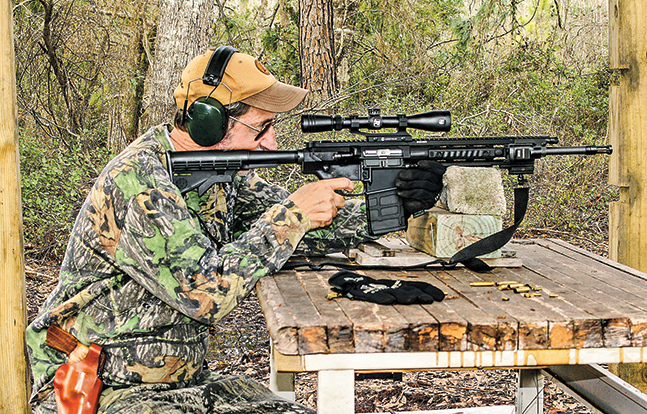 Pre-hunt trips to the range had revealed some interesting things about the SR-762. Its 16.12-inch barrel didn’t react negatively when I screwed on an Advanced Armament Corporation (AAC) Cyclone sound suppressor, and the point of impact only shifted 1.5 inches vertically and 0.75 inches horizontally. Many other .308-class rifles I’ve compared groups with and without a suppressor attached typically shift their point of impact at least twice as far as the stiff-barreled Ruger. Another pleasant experience was the reduced gassing effect with the suppressor attached. The SR-762’s piston system keeps gas out of the receiver area, so the extra powder residue common with direct-impingement semi-autos was greatly reduced. Accuracy differences with and without the suppressor were imperceptible.