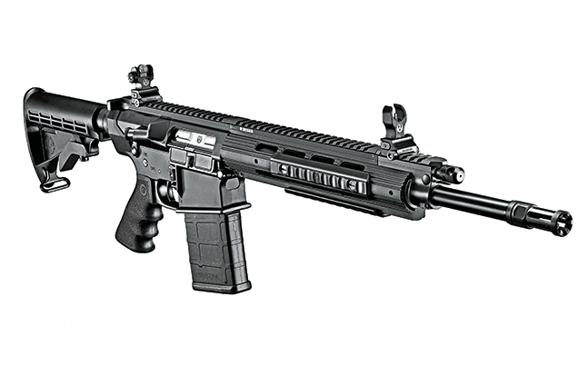The rifle’s heavy-contour, 16.12-inch, chrome-lined, cold-hammer-forged barrel features a 1-in-10-inch twist rate and exterior fluting to reduce weight while still providing outstanding accuracy. Surrounding the barrel is Ruger’s Lightweight Adaptable handguard, which features a long Picatinny rail that mates up with the flattop upper’s. It’s also drilled and tapped for additional rails at the 3, 6 and 9 o’clock positions (two additional rail sections are included), providing ample space for mounting accessories.
