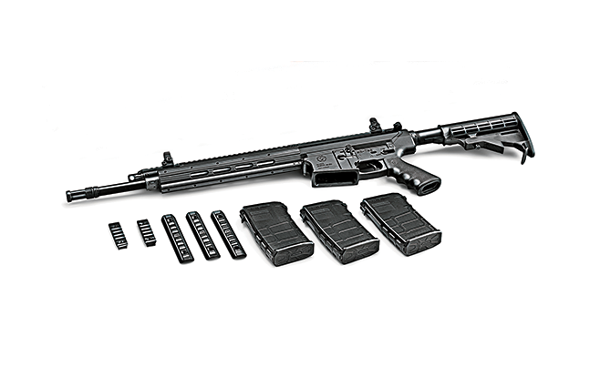 The SR-762 weighs 8.6 pounds unloaded and balances comfortably. The lower receiver features a polymer, collapsible buttstock and a comfortable Hogue Monogrip. The trigger has a surprisingly smooth take-up and breaks cleanly at 6.5 pounds. Three 20-round Magpul PMAG magazines are provided with the SR-762, along with the aforementioned rail sections, rail covers, folding backup iron sights and a sight adjustment tool—all in a soft-sided carrying case.