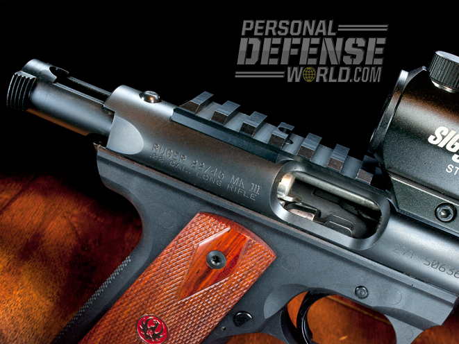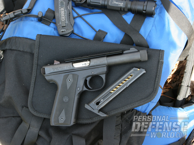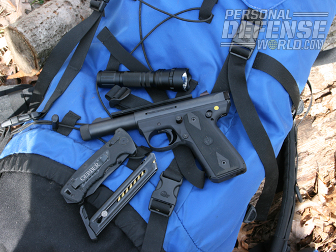A lightweight .22 LR pistol like the Ruger 22/45 can fit into anyone’s bug-out bag, and as a trail gun it takes no effort to carry.