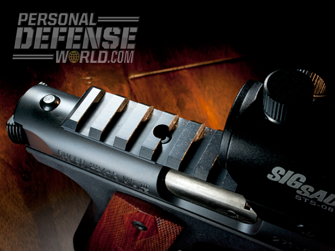 Testing the 22/45 for accuracy using a rest and open sights, I averaged 2-inch groups or smaller. Most 10-shot groups—the capacity of the magazine—were in a 3-inch circle.