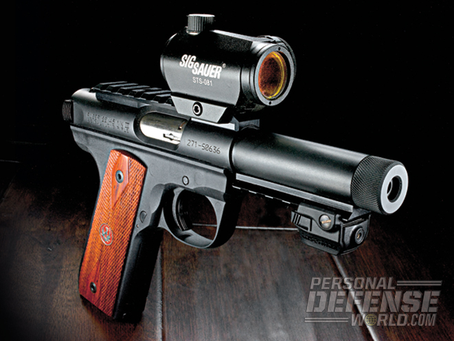 The 22/45 mates Ruger’s renowned Mark III action to a grip frame that provides a feel similar to a 1911. If you are a 1911 shooter, the Ruger 22/45 is a good choice for a rimfire. The safety, magazine release and bolt stop are also in 1911-esque places, though on the 22/45 the slide stop and thumb safety are circular buttons, not levers. The grip frame is polymer, so it is lightweight—a plus for any bug-out bag—giving the pistol a total weight of 32 ounces even with the 4.5-inch bull barrel. The threaded muzzle allows attachment of a suppressor. The sound of a rimfire may attract unwanted attention, but the 22/45 with the threaded barrel helps mitigate the noise signature when used properly. Some bug-out scenarios may cause you to be in a suburban environment, and residents may mistake hunting for aggression. Tread lightly and leave nothing behind, even the sound of the .22.