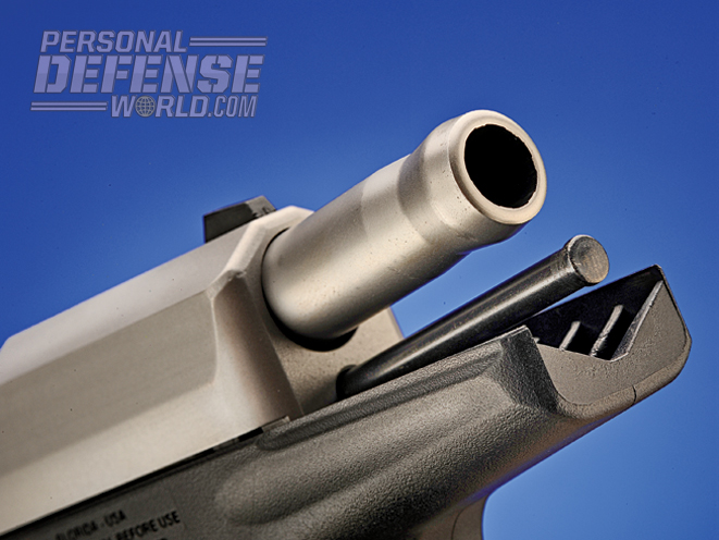The barrel is just a tad over 3 inches long, measuring 0.5 inches wide for most of its entire length until it expands slightly at the muzzle (to .525 inches) to act as a barrel bushing, locking the barrel to the slide on closing. Like most parts of this gun, it is machined from bar stock with seven lands and grooves, producing a 1-in-16-inch right-hand twist. The feed ramp shows some human polishing, which added to the excellent functioning of the weapon with a variety of factory ammo. To make all this work, the recoil spring assembly located below the barrel is all steel, and is fully integrated to make disassembly and reassembly a snap.