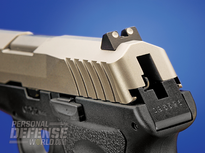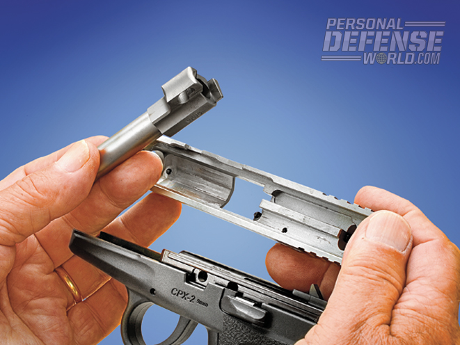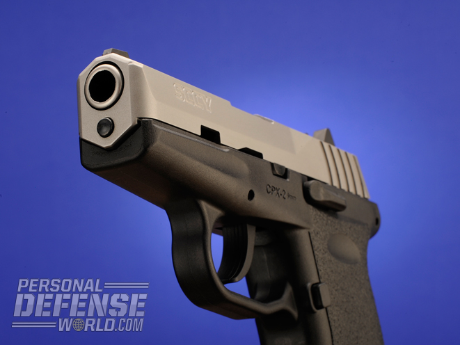 In overall appearance, the gun has that modern look with rounded corners in two distinct models. One is completely shadowy from its polymer frame to its darkened stainless steel, nitride-colored slide. The other model of the CPX-2 has the same dark frame, but with a lighter slide in a more natural stainless shade that is finished by a ceramic abrasion process, resulting in a non-reflective finish. If I were to purchase this gun, this model would be my choice, as even in dim light the sights still seem to pop out for quick acquisition of my target.