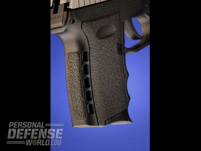 When you consider the purchase of such a concealable weapon, size naturally enters into the equation. The CPX-2 has been designed to fit into the average hand, and I found it very comfortable to hold and shoot. The grip frame has finger grooves molded into the Zytel frame, a material that appeared in the Remington XP-100 back in 1963. Impervious to just about anything Mother Nature could dish out, this space-age plastic seems to go on and on without any bad results of abuse, weather or age. Though complete with the addition of a finger extension, it’s naturally still a little short, but not enough to lose sleep over. On the rear of the grip are what SCCY calls a “recoil cushion” on the backstrap, but, to me, it’s there for effect only. Since the Zytel does not give, the only thing I can figure out is that it allows the air to escape from within during shooting (and compression of the grip in your hand), giving you less of an apparent recoil effect while shooting.