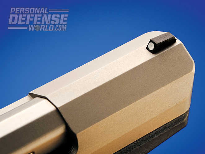 From the muzzle back past the ejection port, the slide is relieved to offer less resistance to using leather gear or drawing from a more concealed position on one’s body. For strength and durability, the receiver (internally on the polymer frame) is machined from 7075-T6 aircraft-grade, heat-treated aluminum, all made from bar stock. The receiver is a very integral part of the gun as it houses the trigger, plunger, trigger cam, ejector, hammer and hammer spring, just to mention a few of the parts needed for the gun to function properly. On the rear of the slide, rakish cocking serrations fill this area; forward is an extractor aptly suited to pulling out the most stubborn spent cartridge. Within the ejection port and to the rear is the mechanical ejector sturdy enough to send those spent cartridges on their way.