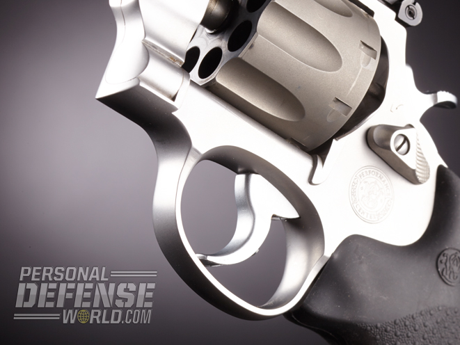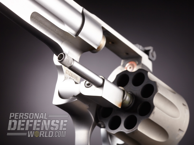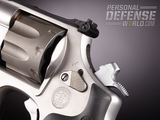 As with all Performance Center revolvers, the Model 929’s action has been tuned to deliver a smooth, stage-free double trigger pull, while the single-action (SA) let is as crisp as the proverbial glass rod breaking. Both the trigger and hammer are chrome plated; the former has an overtravel stop while the latter features a teardrop-shaped spur that is coarsely checkered to assist when thumb cocking the hammer. Cartridge ignition is via a frame-mounted firing pin that is struck by the flat-faced hammer.