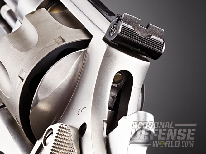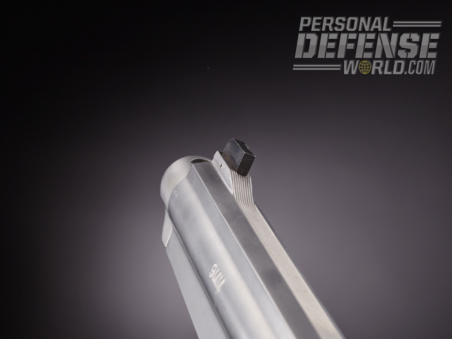 Sighting equipment consists of S&W’s fully adjustable rear sight mated to a Patridge-style blade near the muzzle.