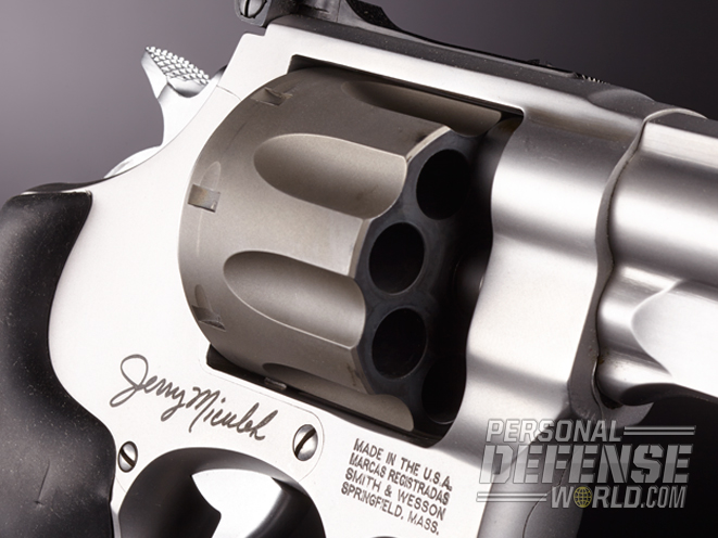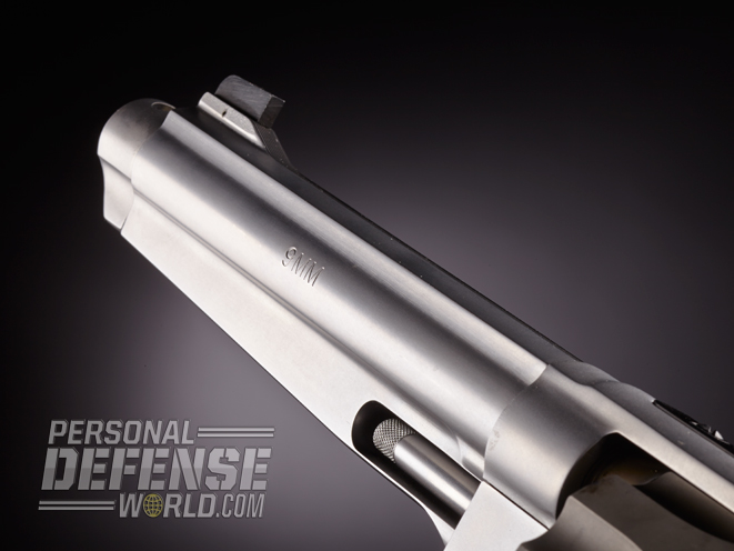 A titanium cylinder is used for added strength and to reduce weight. In addition, the cylinder’s darker finish contrasts nicely with the bead-blasted stainless finish of the frame and barrel. The rear face of the cylinder and ejector have been cut to accept full moon clips while the chamber mouths have been slightly beveled to smooth out reloads.