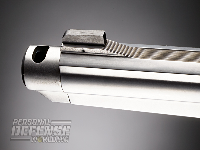 The 6.5-inch barrel has a full-length, tapered underlug to mollify the effects of recoil while a muzzle-mounted compensator reduces muzzle flip. If you don’t wish to use the compensator, or if you’re competing in a division that doesn’t allow it, it can be removed and replaced with a false muzzle in a matter of minutes.