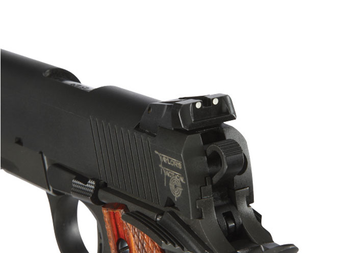 Being a full-size model, the Taylor’s Tactical tips the scale at an even 52 ounces unloaded, which is about the same as the comparably sized Colt Rail Gun. Overall length is 8.75 inches; height with extended magazine base pads is 5.5 inches and width (including the ample diamond-checkered walnut grips) is 1.18 inches. It is a hand-filling sidearm that points naturally and offers excellent sighting capability. The dovetailed rear sight is adjustable for windage and elevation, and the dovetailed front sight (a plain matte black ramp) is interchangeable and can be upgraded to an optional green fiber optic front sight. The sights have rounded edges (like Novak sights) to prevent them from snagging on clothing, but those rounded edges also save hands and tactical gloves from the minor cuts occasionally received from straight-edged adjustable sights.