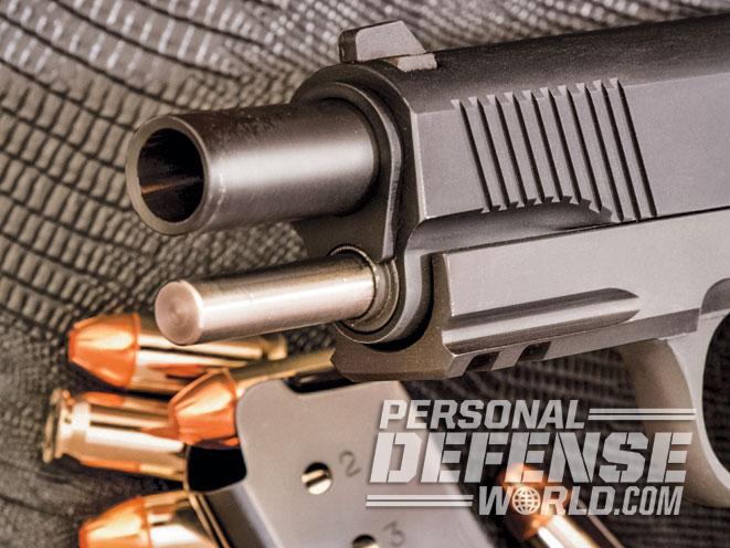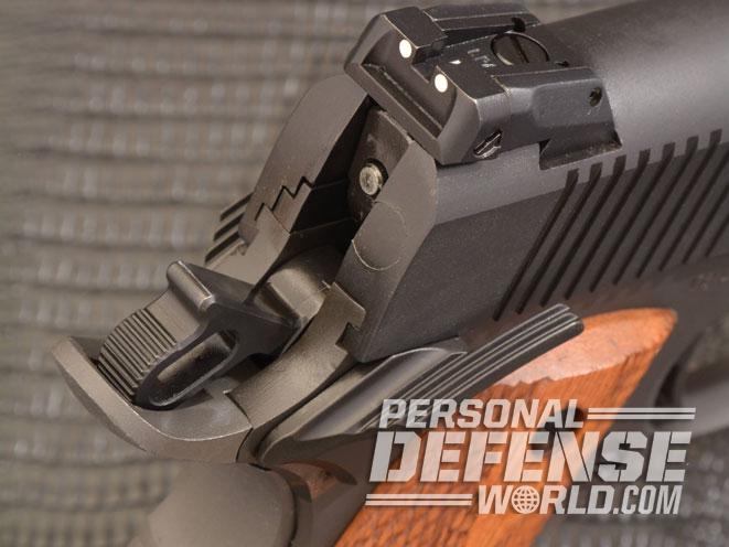 While familiarizing myself with the gun before the range test, I found the checkered magazine release takes a harder-than-normal push to operate, and a little extra with tactical gloves on. But after that the well-made Italian magazines drop out smoothly on the reload. The ambidextrous safeties are also very firm and click in and out of the locked position with unmistakable authority. This also helps to avoid accidentally engaging the safety when using a high grip on the gun. The slide release is firm as well, but no excessive effort is required. The gripping surfaces (checkered walnut grips, serrated frontstrap and checkered mainspring housing) all provide a solid, tactile surface for bare hands or tactical gloves. The skeletonized trigger averaged a smooth 5.8 pounds, with a short, 0.125-inch take-up, crisp break and quick reset.