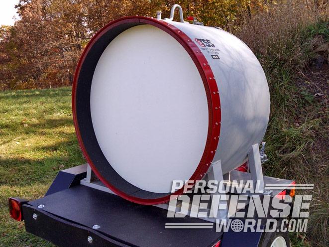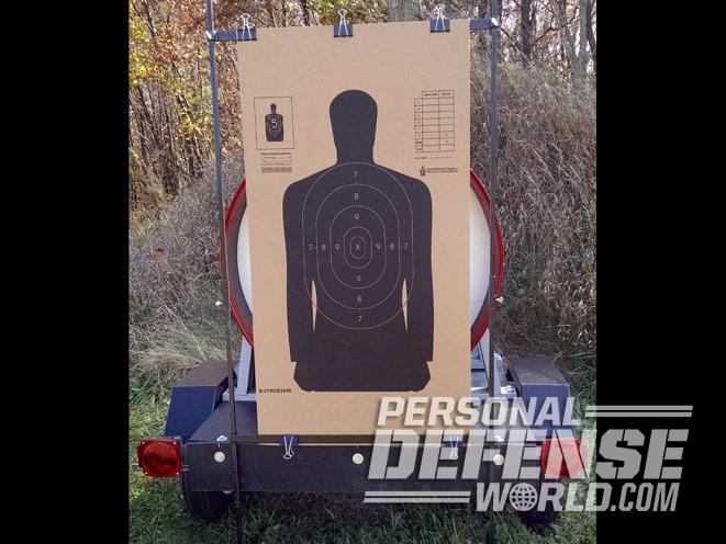 Firing off-hand using a two-handed hold and a Weaver stance, five-round strings were fired from 15 yards at a regulation Law Enforcement Targets cardboard B-27 silhouette placed in front of a Target Shooting Solutions BCS-36 bullet trap. This is the largest TSS model with a 36-inch-diameter target surface. The BCS-36 is used by military and law enforcement for training, and is large enough that it can be set up on a DOT-inspected trailer for easy repositioning and moving from location to location. The BCS-36 uses 12 heavy rubber composite baffles that can stop anything up to a .50 BMG round from point-blank range. Target Shooting Solutions also builds smaller-diameter bullet traps as well as clearing stations currently used by law enforcement, the military and police forensics labs for ballistics testing.