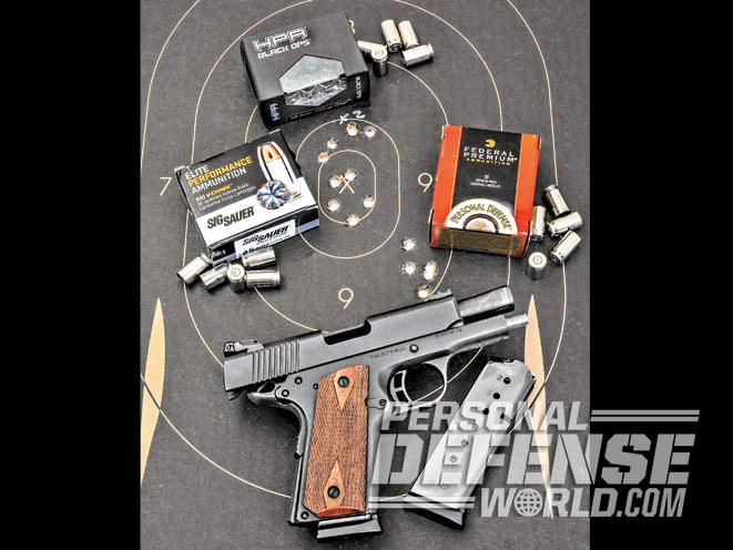 Test ammunition was new HPR Black Ops 150-grain OTF, 200-grain Sig Sauer Elite Performance V-Crown jacketed hollow-point (JHP) and heavyweight Federal Premium Hydra-Shok Personal Defense 230-grain JHP. The lightweight 150-grain Black Ops cleared the ProChrono traps at a smoking 1,005 feet per second (fps), which is fast for a 3.6-inch barrel, while the Sig Sauer clocked 848 and Federal slammed home at 768 fps average.