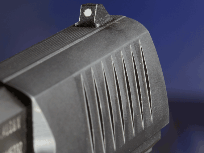 The PPQ M2’s sights were interesting. The rear sight is adjustable for windage only, and the front is adjustable for elevation via a replacement post. Be sure yours is steel, not plastic; I got the steel front sight with a green fiber-optic insert, and it provided an excellent sight picture. Replacing the front sight is easy: Take off the slide, undo the old one from under the top of the slide, and insert and tighten the replacement.