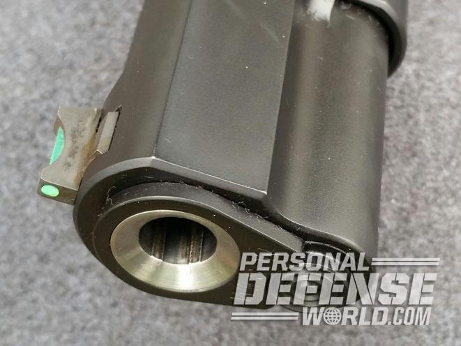 The Tactical Carry 1911 exudes quality. During my initial inspection, parts fitting appeared superlative and the matte blue Armor-Tuff finish was all business; attractive yet non-reflective with no machine marks or any kind of exterior blemish. This is an all-carbon-steel gun except for the match-grade, 5-inch, stainless steel barrel, which has a flush-cut reverse crown. The top of the slide between the sights is finely serrated to eliminate glare. Dovetailed into the front of the slide is a fiber-optic (green) front sight and dovetailed on the rear is a Battlesight with a deep U-shaped notch, also serrated at the rear and adjustable for windage.