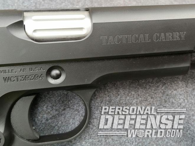 The sides of the Tactical Carry’s slide are deeply serrated with 12 ball endmill cuts, allowing for a good grasp when cycling the slide. The ejection port is flared and the portion of the barrel exposed in the port is fluted. The left side of the slide is laser etched “Wilson Combat” and the right side near the rear has the WC logo. Ahead of the ejection port are the words “Tactical Carry.” The portion of the slide above the end of the frame’s dustcover has a carry cut, while the rear of the slide has 40-line-per-inch serrations and the slide bottom is heavily machine chamfered.