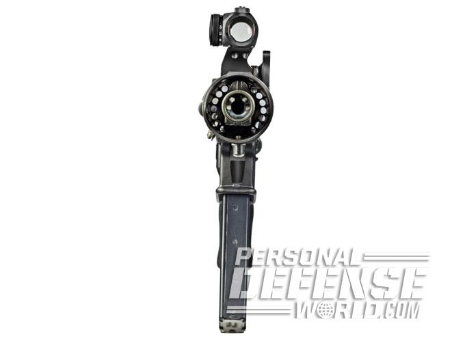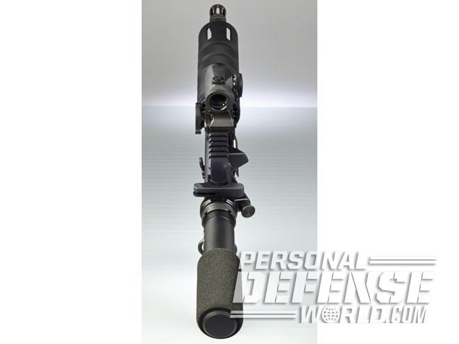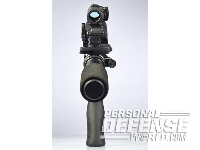 The pistol’s buffer tube is pistol length and has a short foam sleeve around it. While far too short to shoulder, the tube allows the shooter to get a cheekweld for improved accuracy when shooting. While not as precise as an AR rifle, I have found this style of shooting to be very accurate—especially at distances of 25 yards.