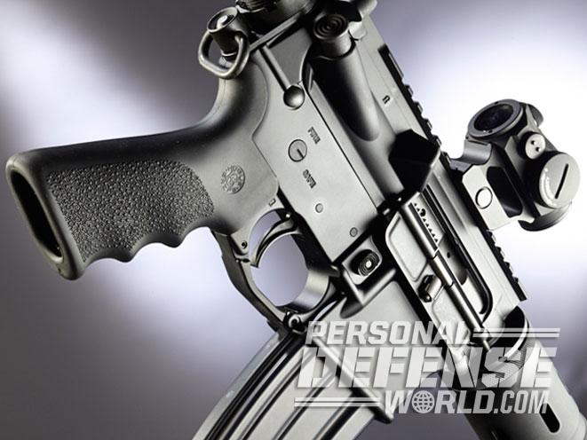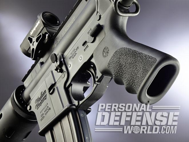 The company opted to use a Hogue OverMolded pistol grip on this pistol. I find these grips to fill the hand better than an A2-type grip, and they are certainly more comfor-t-able. The soft, -textured rubber, which also fea-tures finger grooves, allows you to get a good grip on the gun.