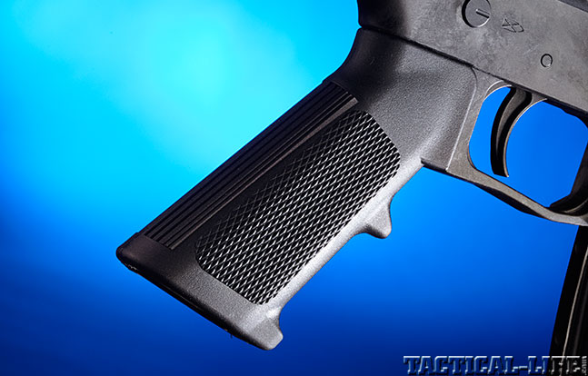 takedown and pivot pins do not protrude from the left side of the receivers, so a tool will be needed to push them out, or at least get them started. That’s not a big deal; a bullet tip works just fine. Also, the charging handle slots in the upper receiver do not have cutouts for removing the charging handle. Instead, the slots run all the way to the rear of the receiver so the charging handle and bolt carrier can be pulled straight out the back. That means you have to be a little more careful when disassembling the gun so that the bolt carrier group doesn’t fall out when the receivers are separated. Besides the integral (instead of hinged) triggerguard—an integral model adds strength—there really aren’t any other significant differences between the composite and aluminum guns.