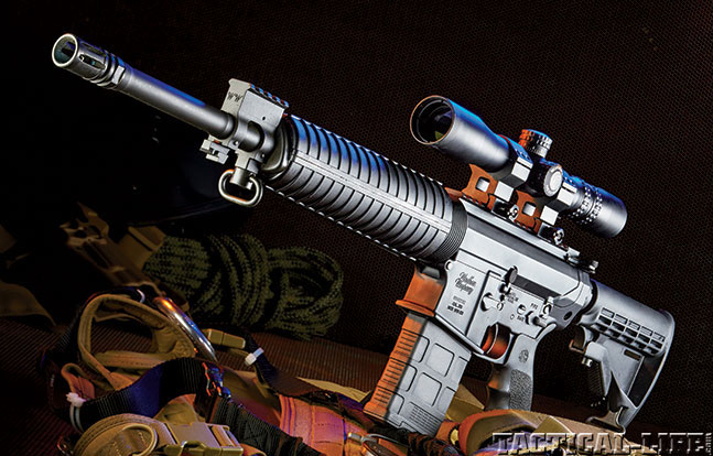The 16.5-inch barrel has a medium contour. Made from mil-spec 4150M chrome-moly-vanadium 11595E steel, the barrel has a chrome-lined bore and chamber with six-groove, 1-in-10-inch, right-hand-twist rifling. The exterior is Parkerized for corrosion resistance, and the barrel is threaded. An A2-style flash suppressor comes installed.