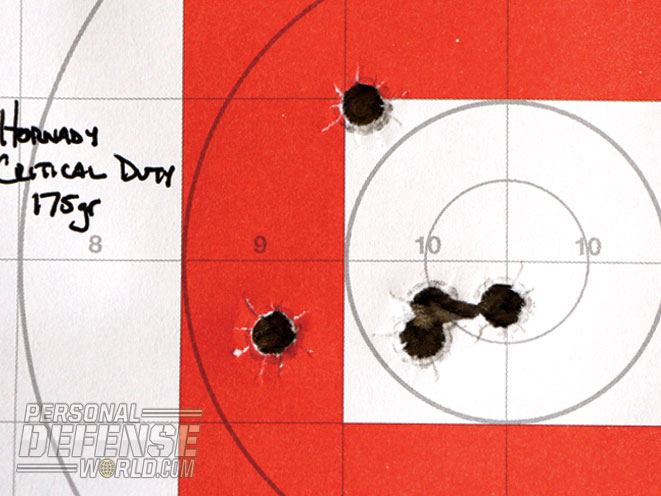 Without a rest, I managed groups of 1.5 to 3.75 inches at 25 yards with a variety of practice and self-defense ammunition. The best results were had with Hornady’s Critical Duty 175-grain rounds, which I managed to shoot into a group measuring 1.5 inches. Using a rest, I would expect less than 2-inch groups for all of the ammo I tested. The gun is certainly accurate enough for law enforcement and self-defense work.