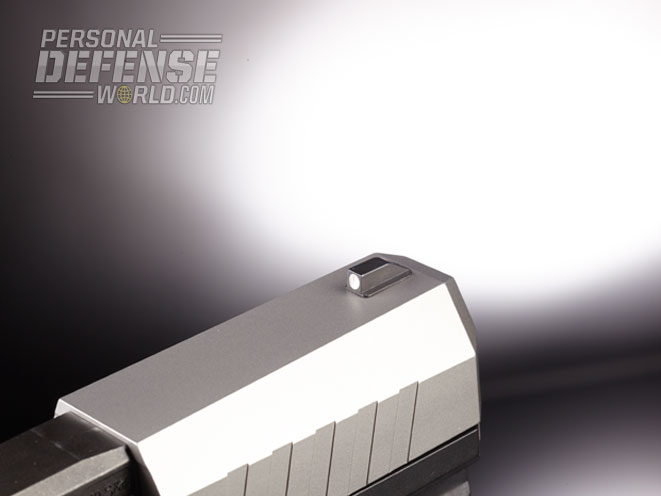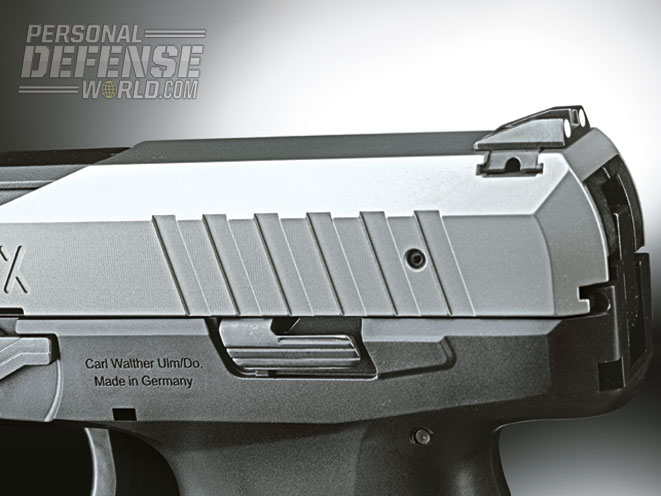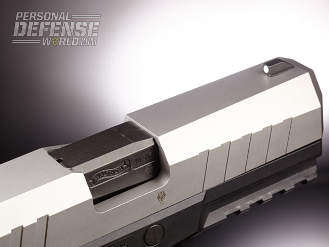Walther PPX slides are available in both a matte stainless finish and a black Tenifer finish. The pistol I tested had a matte stainless-finished slide, which gave the gun an attractive two-tone look. The PPX has a meaty slide, giving the shooter a lot of real estate to use when manipulating it during loading or malfunction drills. Slide serrations on the rear of the slide are deep and offer a lot of purchase when grabbing the slide. There are also shallow serrations on the front of the slide.