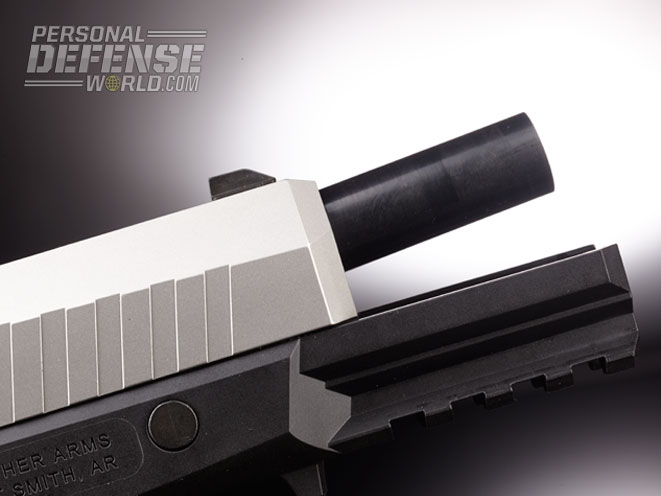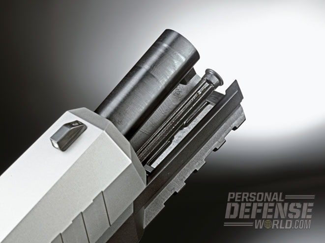 The front edges of the PPX’s slide are beveled. Note the 4-inch barrel.