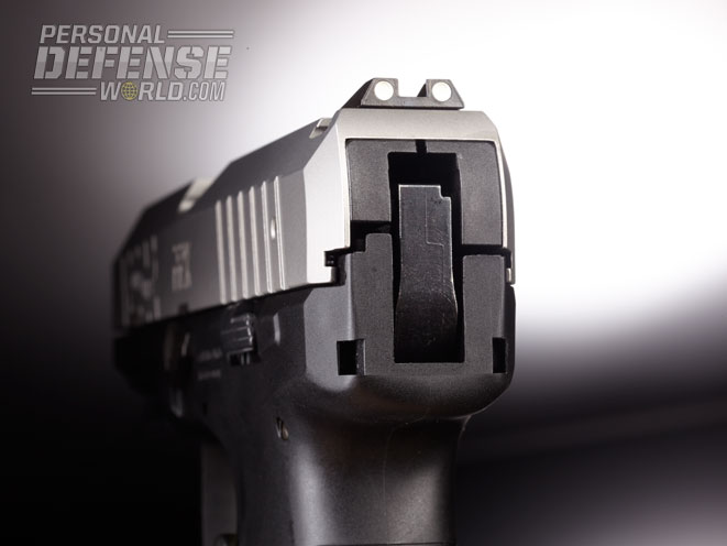 The PPX has three-dot sights, which are typical on many handguns. The front edge of the rear sight is ramped, rather than squared off. Some shooters prefer a ramped front edge to reduce the chances it might snag on clothing during a draw. My preference is having a hard edge on the front of the rear sight. This allows me to use the sight to operate the slide with only one hand in a situation where my second hand is injured or otherwise unavailable. Without that hard edge, the shooter would have to use the ejection port to manipulate the slide. While it will work, using the ejection port can be more difficult than using the rear sight.