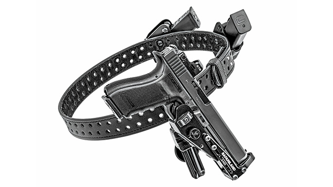 I mounted the holster on Safariland’s Model 032 ELS Competition Belt, which uses the company’s Equipment Locking System (ELS) forks and plates for mounting holsters and accessories (or with the hex-head screws). The belt features two rows of pre-cut holes running its full length to facilitate easy and precise adjustments. The holes also allow mounting of two or more competition magazine holders, which can be positioned to your desired angle and spacing.