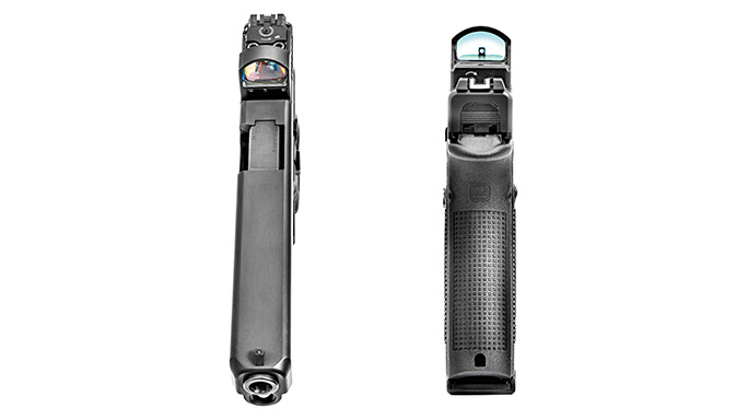 Among key external features for the G40 Gen4 are the new slide and MOS system. The slide is milled and fitted with a removable cover plate that is interchangeable with one of four optics-mounting plates designed to seat a variety of miniature reflex sights from Leupold, Trijicon, C-More and EOTech among others. This lowers the sight base to be more in line with the bore, rather than having a base that is mounted on top of the slide. This MOS design also eliminates the need to remove the rear sight, thus the gun can be quickly changed back to open sights by removing the optics base and replacing the standard cover plate. With an overall length of 9.49 inches, the G40 Gen4 in MOS Configuration also offers an unprecedented 8.19-inch sight radius between the standard white-dot front sight and white-outlined rear sight.
