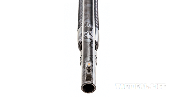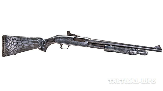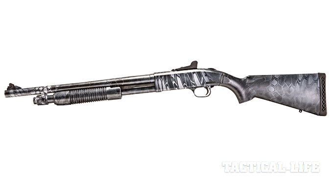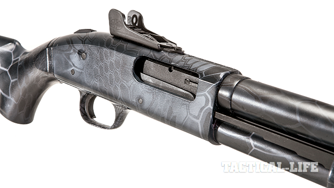 Whether hunting game or two-legged predators, the reptile-looking Typhon camo should do a superb job of breaking up the pattern of the shotgun and helping it blend in. Once Mossberg applies the Typhon camo, the 590A1’s original black coloration still shows through where the urban gray pattern doesn’t cover it.