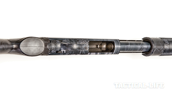 This 3-inch-chambered 590A1 Special Purpose (officially dubbed the model 51522) sports an 18.5-inch heavy barrel, a ghost ring rear sight and a front ramp with a high-visibility orange stripe. Of course, the first thing you’ll notice is the very interesting Kryptek Typhon camouflage. It covers the entire shotgun, including the polymer furniture and the sling swivel stud that screws into the magazine cap. Well, everything except the cushiony buttpad at the end of the stock, with its 14-inch length of pull.