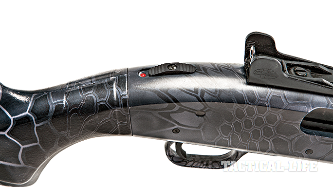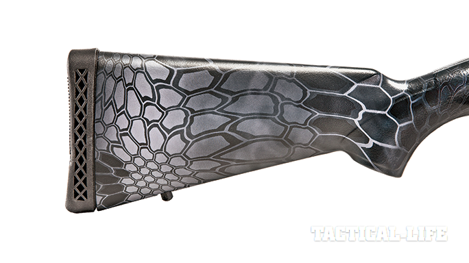 The reptile-looking Typhon camo should do a superb job of breaking up the pattern of the shotgun and helping it blend in.
