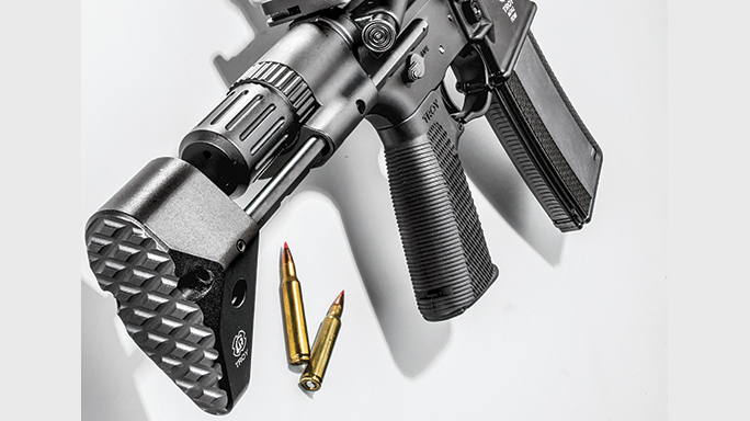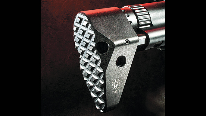 The retractable stock is made of aluminum and is quite sturdy. It’s a complete system that replaces the entire standard buffer tube assembly. The mil-spec bolt carrier and buffer are actually one piece and allow the proper amount of travel for reliable function. Being a Troy product, it’s sturdy as well. The stock slides on two aluminum rails that run along both sides of the lower receiver when collapsed. With the stock collapsed, the rails don’t interfere with the ambidextrous safety’s operation—for the most part. It’s a bit awkward operating the safety lever with the stock collapsed simply because the amount of space above the lever is decreased slightly. A little practice operating the safety is necessary to get fully acclimated to it.