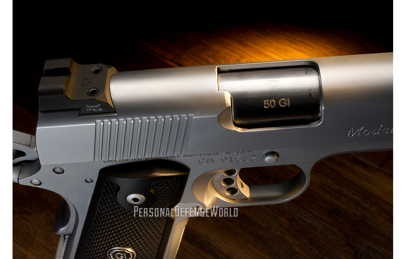 It come in three basic models, all of which are handcrafted. The M1 is a simple, straightforward, full-size combat pistol. With its cartridge base sized to .45 ACP, the rebated-rim .50 GI cartridge keeps to the standard 1911 platform—so much so that a .45 ACP barrel can be fitted to the slide. Coupled with the company’s excellent magazines, you get two pistols in one. And though .45 ACP and .50 GI magazines are a bit different, the pistol fits in any standard 1911 holster.