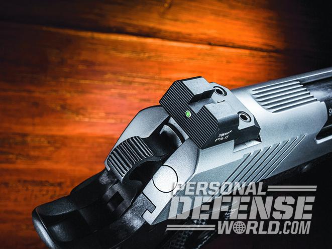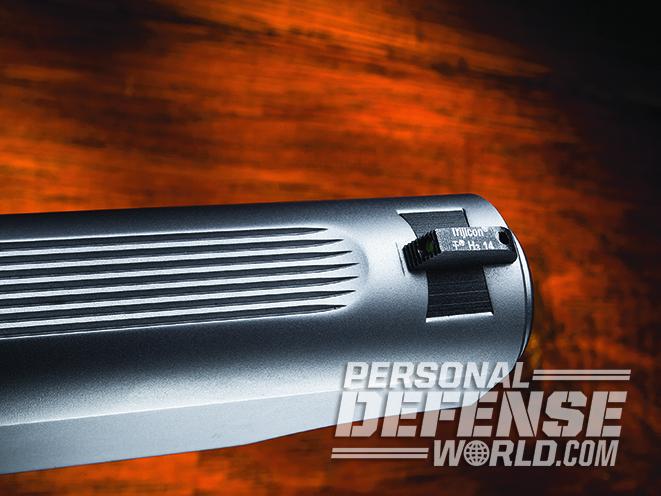 Also machined from a 4140 chrome-moly forging, the slide features deeply cut rear cocking serrations. The top of the slide is also serrated to eliminate glare. Extra-sturdy GI night sights are dovetailed in, and the rear sight features a pronounced shelf and double setscrews for positive one-handed cycling of the slide. The ejection port is lowered and flared, and the pistol uses a traditional internal extractor machined from hardened chrome-moly bar stock.
