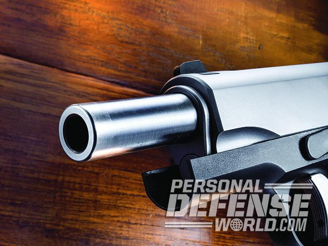 The heavy, match-grade, 4.25-inch barrel is cut from a 416R rifle-grade stainless steel forging. Button-rifled, it has six lands and grooves with a 1-in-16-inch, right-hand twist rate and an 11-degree crown. It is also fitted to a heavy-duty bushing with an extra-thick flange, and the chamber hood is marked with “GI 45 ACP.”