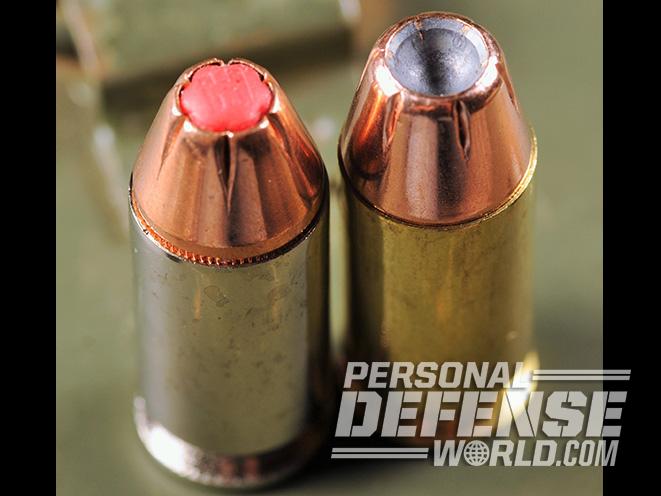 That brings us to hollow points, the most common defensive rounds. Each hollow point has an open cavity at the tip that makes the bullet expand more than an FMJ bullet. The hollow point transfers the maximum amount of energy to the target while decreasing the possibility of overpenetration. Most ammunition manufacturers have hollow-point cartridges designed for defensive shooting and concealed-carry applications. Many manufacturers also offer hollow points with a polymer tip in the cavity. This polymer tip drives into the hollow point and forces the round to expand to a larger diameter.