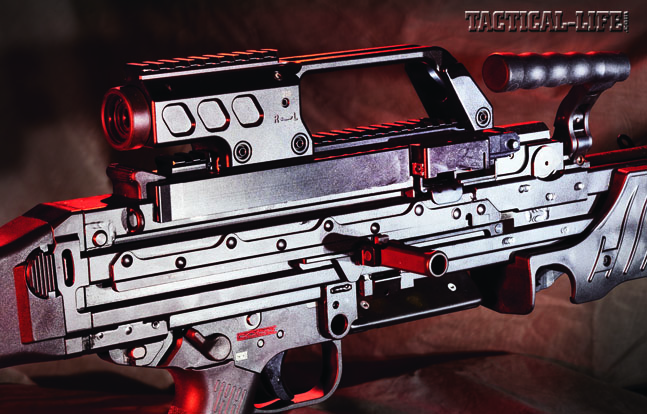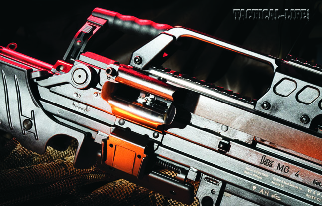 The MG4 is a belt-fed machine gun that one man can carry and operate with an 885-rpm rate of fire. The HK416 is an upper receiver assembly that replaces the direct impingement (DI) gas operating system of the standard M16-style rifle with a short-stroke gas piston. The traditional DI gas system bleeds gas from a port in the barrel, which travels back into the receiver and blows hot gasses and fouling into the rifle’s action, increasing the possibility of malfunctions. The HK416, and its 7.62mm NATO chambered big brother, the HK417, use gas from the barrel to move a piston that transfers the impact to the bolt and vents excess gas out of the handguards. That keeps the rifle’s action cooler and cleaner. In hostile environments and high-volume firing situations, the installation of an HK416 upper can extend the life of the M16-styled rifle—and its user!