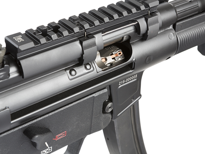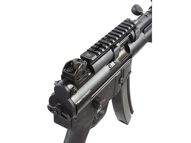 In typical HK long-gun fashion, the SP5K’s charging handle rides forward of the receiver on the left side, and it has to be drawn back and pulled up to lock the gun open. Also, the bolt does not lack back after the last round in the magazine has been fired. Instead, the bolt closes itself on an empty chamber.