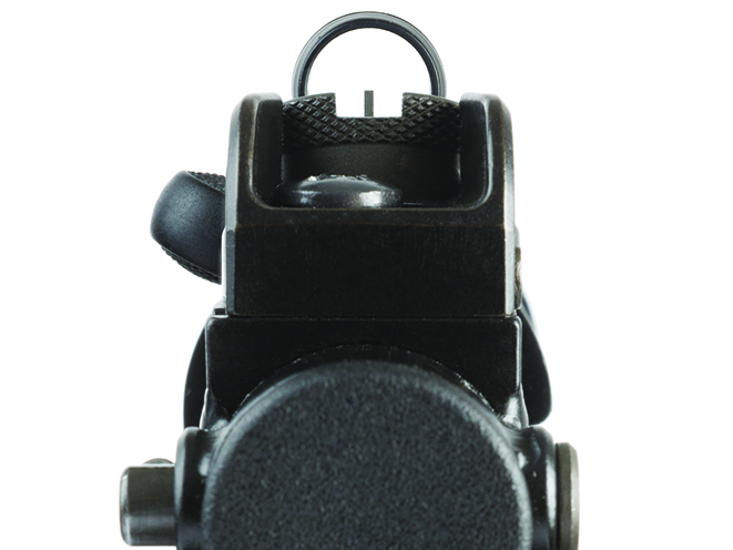Another feature of HK’s classic roller-lock weapons is the drum-type, adjustable diopter rear sight. As I looked across the turret, I saw that HK had wisely left out the array of apertures normally seen on the rifles and submachine guns, knowing that most shooters won’t be able to align a front sight through a peep sight while holding the SP5K as far from the eye as handguns are normally held. The good news is that my test gun came out of the box with the turret adjusted for center hits using a post-in-notch sight picture at 25 yards.