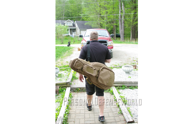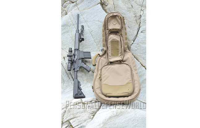 There is a carrying handle on the top, and a strap can be added to the D-rings for shoulder carry. The bag is 37 inches long and looks like an elongated tennis-racket case or perhaps a violin case. It’s available in tan, gray, ATAC, black, or a pink and black, and less tactical colors like red or blue may be on the horizon.