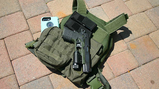 A nice option to have with the handgun is a light tactical vest. It should have extra magazines and a flashlight. Another great item to have is a cell phone. Many cell phones have an option where, even when you no longer pay for cellular service, you can still call 911. Everyone has a couple of old, unused cell phones lying around. Check and make sure they have the “911 only” option in advance.