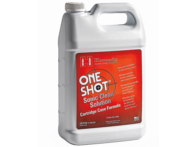 The sonic cleaner works best with the One Shot sonic cleaning solution from Hornady, although other liquid media work as well. This formula, available in quart-sized containers, is specifically designed to clean brass and will remove carbon as well as any oxidation and tarnish. One quart of One Shot will offer over 60 washes before it needs to be replaced.