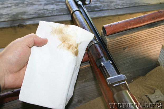 Applying the technique listed above, the metal from the Type 53 quickly came clean, without a lot of scrubbing. The stock had some finish left on it, which had a used, weathered look. The bore of the Type 53 had decades of crud in it, and after a pile a patches the final patch came out white.
