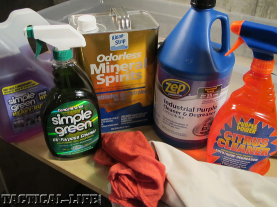 Prep: Before cleaning, make sure you have a clear, open workspace that is well lit and ventilated. You will also need a large plastic tub to hold the barreled action and all the other metal parts. I used a 41-quart plastic bin that measured 35 by 16 by 5 inches. Next is a degreasing solution: eco-friendly degreasers like Simple Green (no odor, biodegradable, nontoxic) or Purple Power Citrus Cleaner can be used. ZEP is another common degreaser I have used it in the past, but I prefer my old standby, low-vapor mineral spirits. Whatever solution you use, read the label. Buy at least one gallon since your particular firearm may need numerous applications. Also have on hand an old paintbrush, a toothbrush, rubber gloves and safety glasses. For the wood stock, you will need paper towels, a hair dryer, masking tape and black, plastic garbage bags.