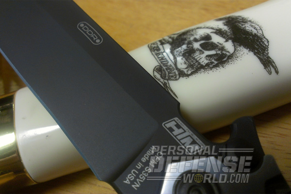Fit and finish are excellent throughout, as one would expect from Darrel Ralph and Hand-Tech-Made Knives. The knife blade is opened by swiping the index finger on the “flipper” guard (which is textured to provide purchase). It snaps open smoothly and locks with authority. There is absolutely no play in any direction. The frame lock engages the knife tang firmly with plenty of room for wear and is easily disengaged with one hand. The ergonomics of the knife cannot be understated. This is a superbly comfortable knife whose large handle is suitable to different users’ hand sizes. The curves of the frame are subtle, allowing the user to adjust his or her grip for optimum results, while the 3-D-carved texture affords excellent traction and also makes the knife very visually appealing. It’s reminiscent, in fact, of some sort of prehistoric sea creature, graceful as it carves through the water in search of prey.