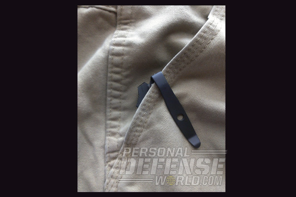 The blade has a stonewashed finish that nicely matches the tone of the handle. As for carrying a megafolder like this, that’s easier done than one might think. Even at 6 inches closed, the knife all but disappears in an otherwise empty pants pocket, thanks to its low-profile pocket clip. The clip had good tension out of the package (the knife ships in a zippered pouch inside a cardboard gift box) and is removable. It is configured for right-hand, tip-down carry only.
