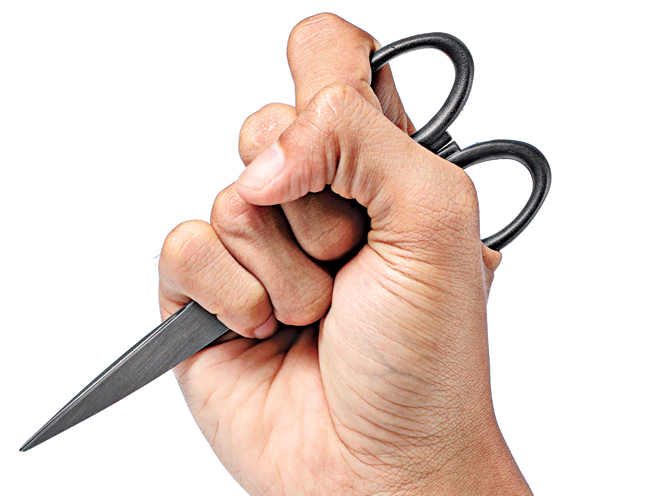 Nearly everyone carries a set of keys with them, no matter where they go. Holding your keys in your hand not only appears normal, but also belies the fact that you possess a devastating offensive weapon—ready in an instant if you are ever caught by surprise and attacked. For personal defense, let a few of the keys on the ring protrude through your fingers and press them against your knuckles for a solid hold. Allow only an inch or so to protrude in order to leave enough of the key in your hand for stability. This weapon is intended for extreme close-contact defense. Use slashing motions towards your attacker’s face as well as straight jabs into his vital areas, including his eyes, throat and groin, to create stinging and intense pain. Damage to his eyes may temporarily blind him, giving you the opening to escape.